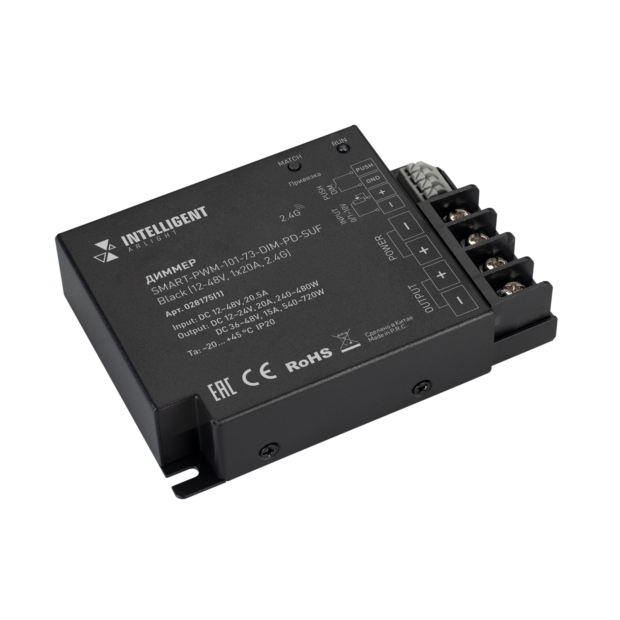 INTELLIGENT ARLIGHT Диммер SMART-PWM-101-73-DIM-PD-SUF Black (12-48V, 1x20A, 2.4G) (IARL, IP20 Металл, 5 лет) 028175(1) в Набережных Челнах