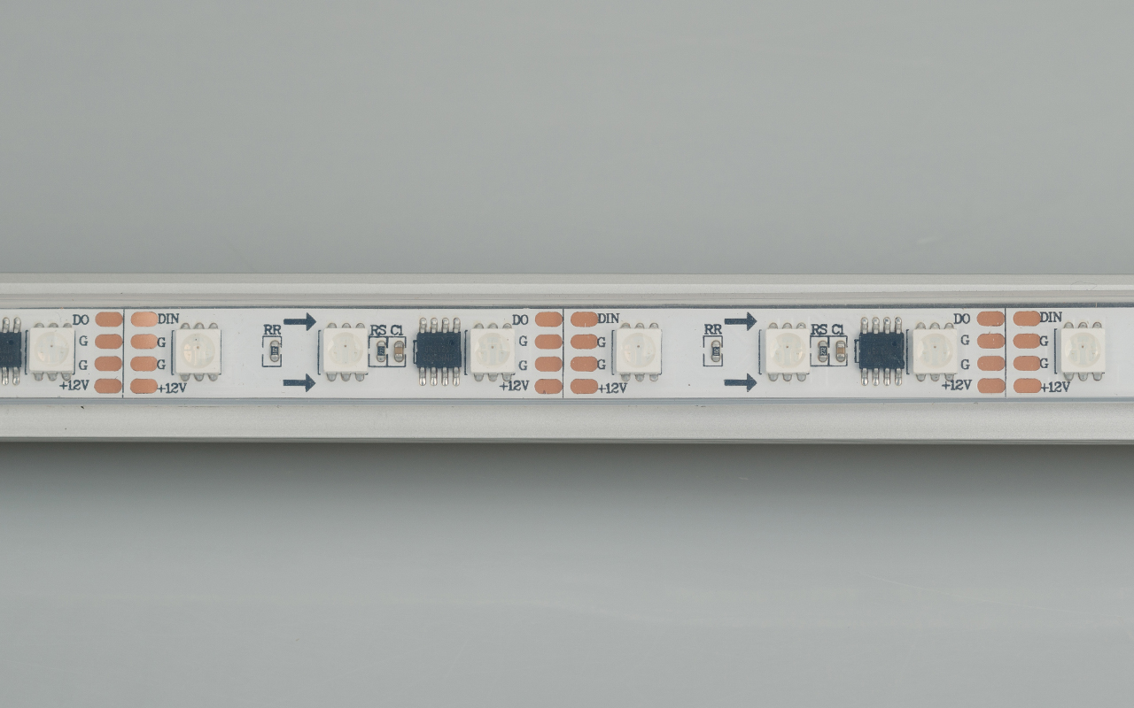 Герметичная лента «бегущий огонь» с драйвером 1804 для применения в сухих и влажных помещениях. RGB-светодиоды SMD 5060 (60 шт/м) с силиконовым покрытием, высокая степень пылевлагозащиты (IP66). Встроенный в ленту контроллер с циклическим автозапуском 300 программ (auto mode), возможно подключение внешнего контроллера. Ширина платы 12 мм, мощность 13.2 Вт/м, напряжение питания 12 В. Создание рекламных вывесок, оформление витрин, помещений для дискотек, ресторанов, театрализованных шоу, изготовление медиафасадов. Минимальный отрезок 50 мм.